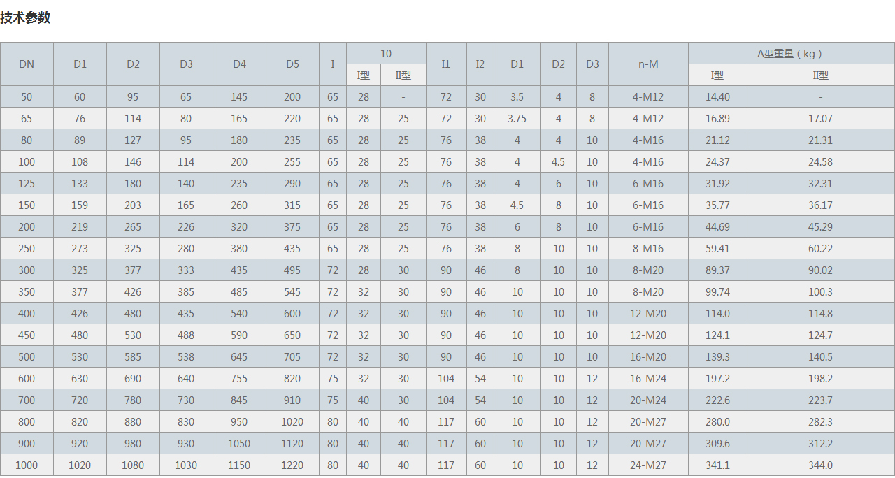 DN D1 D2 D3 D4 D5 I 10 I1 I2 D1 D2 D3 n-M A型重量(kg)